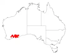 It is endemic to an area in the Goldfields-Esperance, Wheatbelt and Great Southern regions of Western Australia where it is found on flats and undulating plains growing in sandy, clay, loamy or gravelly soils.[1]