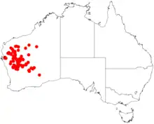 In Western Australia it is found scattered across a large area in the Wheatbelt, Mid West and Goldfields regions of Western Australia.[4] It is also found through interior areas of South Australia.[1]