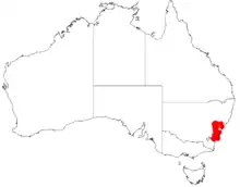 The shrub has a distribution in the Great Dividing Range and the associated foothills in western New South Wales from around Rylstone in the north down to around the Clyde River in the south where it is growing in sandy or loamy soils as a part of heath and Eucalyptus woodland communities.[2] It is often found on and around sandstone outcrops as a part of dry sclerophyll forest and heathland communities.[1]