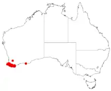 It is native to an area along the south coast in the Goldfields-Esperance, Great Southern and South West regions of Western Australia where it is commonly situated along watercourses and swampy areas.[1] The bulk of the population is found from south of Nannup and the Scott River in the west to around Albany in the east with an isolated population found much further east around Esperance where it is found in forests that also usually contain species of Melaleuca or Banksia and is also located within karri forest communities.[2]