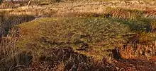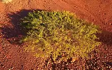 The low spreading, viscid shrub typically grows to a height of 0.2 to 1 metre (1 to 3 ft).[2] The obscurely ribbed branches normally spread horizontally giving the shrub a flat-topped appearance. The green to grey-green phyllodes are solitary or sometimes in clusters of two or three at the nodes. Each phyllode is 2 to 7 centimetres (0.8 to 2.8 in) in length and has a diameter of about 1 millimetre (0.04 in) and are straight or curve shallowly upward.[1] It blooms from March to October producing golden yellow flowers.[2] The simple inflorescences have an erect flower spike that is 10 to 45 mm (0.4 to 1.8 in) in length. Following flowering flat, thick and linear dark brown seed pods with a length of 2 to 8 cm (0.8 to 3.1 in) and a width of 2 to 6 mm (0.08 to 0.24 in). The erect and woody pods are sticky with resin and have an odour resembling like citronella or lemon grass. The ellipsoidal dull to slightly shiny brown seeds are 3 to 5.5 mm (0.12 to 0.22 in) long.[1]