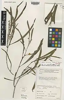 The spindly shrub or tree typically grows to a height of 2 to 7 metres (7 to 23 ft)[2] and has terete and glabrous branchlets that are often covered in a fine white powdery coating. Like most species of Acacia it has phyllodes rather than true leaves. The glabrous, leathery and evergreen phyllodes have a narrowly elongate-elliptic to linear shape and are straight to slightly curved with a length of 15 to 25 cm (5.9 to 9.8 in) and a width of 6 to 14 mm (0.24 to 0.55 in) and have one prominent central nerve, with a second weaker longitudinal nerve occasionally present.[3] It blooms from May to June and produces yellow flowers.[2] The axillary or terminal inflorescences have spherical flower-heads with a diameter of about 5 mm (0.20 in) and contain 46 to 56 densely packed golden coloured flowers. The leathery to sub-woody seed pods that form after flowering have a linear shape and are flat and straight with a length of up to around 11 cm (4.3 in) and a width of 10 to 11 mm (0.39 to 0.43 in).[3]