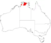 The species is found in northern parts of the Northern Territory on the north western edges of the Arnhemland sandstone plateau.[2] It is found in parts of the East Alligator River and its tributaries including Cooper Creek in Kakadu National Park where it grows along creek lines in sandy soils.[1]
