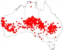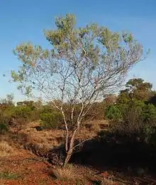 It is widespread throughout Australia's arid zone, occurring on sand ridges and in disturbed areas. In Western Australia it has a scattered distribution throughout the Pilbara, Gascoyne, Mid West, northern Wheatbelt and Goldfields-Esperance regions where it is commonly situated on sandplains, sand dunes and along creek-lines growing in sandy soils.[4] The range of the tree extends from around Shark Bay and North West Cape in the west to the east through northern South Australia and the interior of the Northern Territory to the western edge of the Great Dividing Range around Mitchell in Queensland and Narrabri in New South Wales where it is usually part of mulga or spinifex communities.[3]