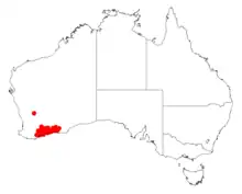 It is native to an area in the Wheatbelt, Great Southern and Goldfields-Esperance regions of Western Australia where it is commonly situated along salt rivers and creeks and along the margins of salt lakes and salt pans growing in sandy, sandy-loam or clay soils.[2] The range of the plant extends from around Pingrup in the north west to around Mount Ney in the east.[3]