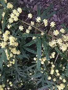 The slender willowy shrub or tree typically grows to a height of 2 to 5 metres (7 to 16 ft).[1] The slender erect habit forms a dense crown of evergreen foliage.[2] The branchlets are normally glabrous and ribbed.[3] The feather like phyllodes[2] are large made up of two to five pairs of pinnae with the larger being 25 to 80 millimetres (1.0 to 3.1 in) in length. The pinnae are made from 12 to 30 pairs of glabrous green pinnules that are only 3 to 6 mm (0.118 to 0.236 in) long and 1 to 2.5 mm (0.039 to 0.098 in) wide.[3] It blooms from July to December and produces cream-yellow flowers.[1] The flowers are supported in inflorescences that normally contain 15 to 25 flowers. It will later form seed pods that are around 60 mm (2.4 in) long and 3 to 4 mm (0.12 to 0.16 in) containing oblong seeds. The plants are sometimes known as cat bush from there offensive odour.[3]