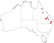 It is a disjunct distribution and is endemic to a small area in the Carnarvon Range in south eastern Queensland and around 300 km (190 mi) further south between Djuan and Karara where it is found in dissected sandstone country in skeletal soils as a part of open woodland communities.[1]