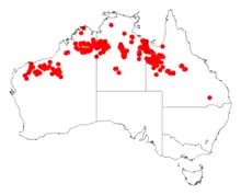 It is native to an area in the Kimberley, Pilbara and northern Goldfields-Esperance regions of Western Australia where it is commonly situated along creek beds, on rocky sites and hillsides growing in sandy or loamy soils.[2] The range of the shrub extends from around Fitzroy Crossing in the south west to around the Wunaamin-Miliwundi Ranges in the northwest extending eastwards into the Northern Territory and across the top end to around Mount Isa in central Queensland with some outlying populations around Pine Creek, Northern Territory and the Reynolds Range in the Northern Territory and Torrens Creek in Queensland. It is usually part of tall shrubland or low open woodland communities and is usually found with Eucalyptus brevifolia and species of Triodia.[3]
