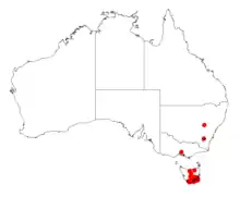 Acacia riceana is endemic to the southeast corner of Tasmania where it grows from sea level to 900 m (3000 ft). Its main populations center around the Derwent, Huon and Prosser River Valleys, although small populations are also located on the slopes of the Ironbound Range in the state's far south. The species also grows densely on slopes overlooking the D'Entrecasteaux Channel from Southport to Margate. Outlying populations grow on the Tasman\Forester Peninsula and South Bruny Island with the most remote being located on Maria Island.