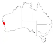 It is native to an area in the Mid West region of Western Australia where it is often situated on low rises and sandplains growing in sandy or sandy-loam soils.[1] The range of the plant extends from around Geraldton in the south to about 50 km (31 mi) north of the Murchison River where it is usually a part of mixed open scrub, tall shrubland or open heathland communities.[2]