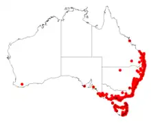 The species occurs naturally on sandy soils in heathland and dry sclerophyll forest in South Australia and Victoria, Tasmania, New South Wales and Queensland.[3]