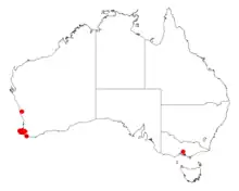 It is native to an area in the South West region of Western Australia where it is found in damp locations growing in clay-loam or sandy lateritic soils.[3] It has a limited range around the Blackwood River to the north east of Augusta as a part of Eucalyptus marginata forest communities.[1]