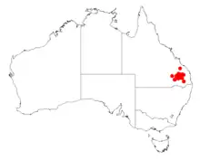 It is endemic a few small sized areas of South East Queensland including Glenmorgan, Boondooma and Impey pastoral properties where it is found growing in gravelly ironstone soils as a part of Acacia harpophylla scrub or open Eucalyptus woodland communities.[1]