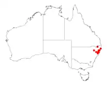It is found in the north east of New South Wales from the North Coast to the edge for the Northern Tablelands[3] where it is commonly situated on exposed sites on escarpment ridges at higher altitudes as a part of wet sclerophyll forest or scrubland and along the margins of cool-temperate rainforests with a range that extends from around Werrikimbe National Park in the south where it is quite common on Mount Boss and Mount Banda Banda[3] to Washpool National Park in the north.[1]