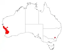 It is native to an area in the Wheatbelt and Mid West regions of Western Australia where it grows in gravelly lateritic clay-loam soils.[1] The shrub is situated from around Kalbarri in the north and extends south east to around Tammin and Brookton.[2]