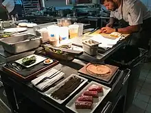The restaurant served five- and ten-course tasting menus,[6][7] as well as "upscale" contemporary American cuisine such as cheeseburgers, lobster rolls,[8] lobster pot pie and a Wagyu steak dinner.[9] The dishes on its menu were often heavy and rich. Writing for Time Out, Julia Kramer noted the relative affordability of its prices compared to similar restaurants.[4]