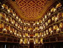 In the palace, designed by Giuseppe Piermarini and Paolo Pozzo in the neoclassical style, is the Teatro Scientifico (Scientific Theater) by Antonio Galli da Bibbiena, with a bell-shaped plan and four tiers of superimposed boxes, intended for the Academy's solemn events and inaugurated in 1769. Wolfgang Amadeus Mozart played here on 16 January 1770, when he was thirteen-year-old.[5][7]