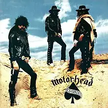 Like the song "Shoot You in the Back", the Ace of Spades artwork employs a classic wild west motif. Originally the idea for the album cover was to have it in a sepia tone and have gunfighters at a card table, but the band decided against it. They decided instead to have themselves in the desert dressed as cowboys. The 'Arizona desert-style' pictures used on the album sleeve and tour programme were taken during a photo session at a sandpit in Barnet.[6] Each of their cowboy outfits were based on different type of Western protagonist. Eddie was based on Clint Eastwood's character, The Man with No Name from the Dollars Trilogy. Phil's costume was based on Marlon Brando's character in One-Eyed Jacks. Lemmy's costume was claimed by Phil to be inspired from Bret Maverick from the TV show Maverick. Contrary to popular belief, the sky was not real and was airbrushed in due to it being very cloudy that day.[7]