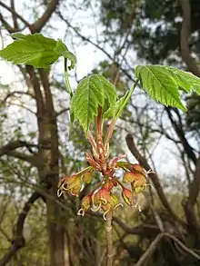 The winter buds are ovate to oblong-ovate, dark brown in color, and protected by 6 to 8 pairs of pubescent scales. Petioles are long and slender from 4 to 10 cm, with some pubescence at their apices. The deciduous leaves have five lobes, and are from 10 to 12 centimetres in length and breadth. They are cordate or subcordate, and rarely basally truncate. The lobes are broadly ovate, acuminate, and distally dentately serrate, or one might say crenately dentate, with the teeth broadly acute or even obtusish. The middle lobe is larger and itself frequently slightly three-lobed. The two basal lobes are smaller have perhaps one or two teeth on their margins. Young leaves have long silky caducous hairs, and retain some pubescence on their undersides at maturity.[8]