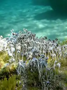 Acetabularia is a genus of green algae in the family Polyphysaceae.[4] Typically found in subtropical waters, Acetabularia is a single-celled organism, but gigantic in size and complex in form, making it an excellent model organism for studying cell biology.[5] In form, the mature Acetabularia resembles the round leaves of a nasturtium, is 4 to 10 centimetres (1.6 to 3.9 in) tall and has three anatomical parts: a bottom rhizoid that resembles a set of short roots; a long stalk in the middle; and a top umbrella of branches that may fuse into a cap. Unlike other giant unicellular organisms, which are multinucleate, members of this genus a single nucleus located in the rhizoid and allows the cell to regenerate completely if its cap is removed. The caps of two Acetabularia may also be exchanged, even from two different species. In addition, if a piece of the stem is removed, with no access to the nucleus in the rhizoid, this isolated stem piece will also grow a new cap.[6]