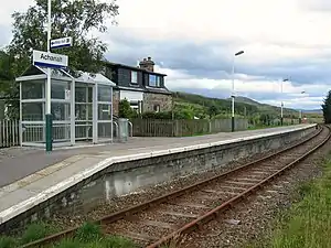 Achanalt railway station is a geographically remote railway station on the Kyle of Lochalsh Line, serving the village of Achanalt in the north of Scotland. The station is 21 miles 34 chains (34.5 km) from Dingwall, between Lochluichart and Achnasheen.[4] ScotRail, who manage the station, operate all services.