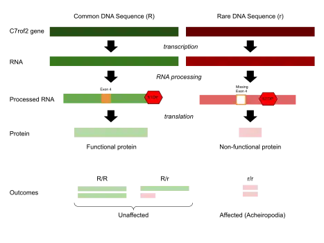Acheiropodia results from a change in the DNA sequence of the C7rof2 gene.[5] When this altered DNA is transcribed to RNA, the resulting RNA transcript is processed differently from unaltered RNA. A segment of the processed RNA transcript called exon 4, which codes for a segment of the protein, is missing, causing the process of converting the transcript into a protein to stop too early.[6] This leads to a shorter, non-functional protein.