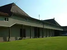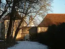 Achstetten Castle is a spacious three-storey building in classicist style with a risalit in its centre.[2] Two wings are loosely attached to the main structure at a right angle. These two wings function as economy buildings. On three sides the castle is surrounded by a large park, which is home to an enclosure where fallow deer are kept.[3] The main access to the castle is by a driveway measuring about 150 metres (490 ft) long. Noteworthy of the interior are a classicist staircase, 19th century furniture, an iron stove from 1798, portraits of the Freyberg family and a porcelain collection.[4] A raised and roofed passageway on wooden pillars connects the castle to the nearby church.[5] This passageway has a length of approximately 100 metres (330 ft).[6] Passageways of this kind, which enabled the lord of the castle and his family to enter the church without being subject to the weather, were not uncommon; remnants of such a construction can also be seen at Großlaupheim Castle.[7]