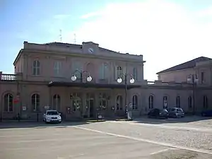 The station was opened on January 3 1858, when the railway section for Alessandria was inaugurated. The plant remained open until 1874, when the continuation to San Giuseppe di Cairo was opened for operation. In 1893 the station was reached by the Asti – Ovada, first section of the line to Genoa.[1] On 25 May 1976, the last Three-phase AC railway electrificationtrain, hauled by the E.432.008, arrived at this station. A few minutes from the arrival, the E.432 lowered the pantographs and direct current was introduced into the now formerly three-phase two-wire overhead line. According to the 2003 line files, the route of the historic Asti-Genoa line is now divided into two lines, the Asti–Acqui Terme[2] and Acqui Terme–Ovada-Genoa.[3]