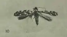 The larvae feed on Pseudopanax crassifolius. They mine the leaves of their host plant. The mine is a simple gallery, more or less straight in its direction. It is made entirely in the upper surface of the leaf. The mine starts in a more or less oblique direction till it reaches the midrib or margin of the leaf. It follows the margin till it reaches the end of the leaf, and it then either turns back alongside its former track or continues back along the barrier on the other half of the leaf. It never crosses the midrib except in its upper part. On the margin of the leaf the mine closely follows all the irregularities of the outline, and extends into the bases of the serrations of the leaf. Portions of the earlier mine may be enveloped by the later broader gallery. The colour of the mine is light green in fresh mines. Margins of the mine are fairly regular and white. The frass is almost fluid in nature, and occupies a fairly broad brown band in the centre of the early gallery, but in the wider part is dark green or black, and often forms an unbroken line on one side of the gallery. It is sometimes deposited in short curved transverse lines with the concavity directed forwards. It appears to be deposited chiefly on the upper cuticle of the leaf.
