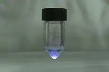 ![]() Cherenkov radiation from a sample of Ac-225 (17 mCi), photo by Dr Andrew R Burgoyne at ORNL | |
