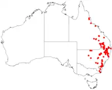 It is found in eucalypt woodlands and shrubby heaths in both Queensland and New South Wales.[3]