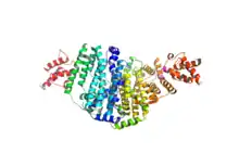2XZ0 and 2XZ1 show the dramatic change in conformation of the enzyme when bound (2XZ1) and unbound (2XZ0). As a dimer, the fatty acid chain binds to a hydrophobic pocket at the interface of the two dimers,.[6] This central channel is mirrored by binding sites for the electron donors on either side.