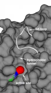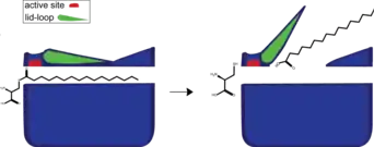 Mechanism of how acyl-protein thioesterases release their product by using a flexible lid-loop covering the substrate binding tunnel. Nature Communications 8(1):2201, Creative Commons Attribution 4.0 International License, https://creativecommons.org/licenses/by/4.0/