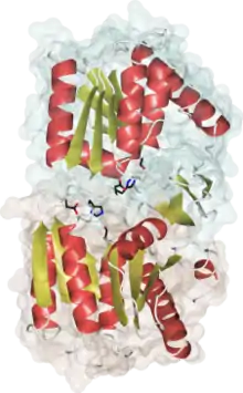 Crystal structure of human APT1, PDB code 1fj2. Alpha helices are in red, beta strands in gold, catalytic site residues in black. The 2 different monomers of the dimer are shaded in green and brown.