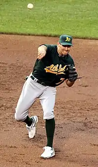 On November 30, 2012, Rosales avoided arbitration by signing a one-year, $700,000 deal with the A's.[10] He began 2013 on the disabled list, and was activated on April 25, replacing Andy Parrino.[11] In the ninth inning of a game on May 8, 2013, Rosales hit what appeared to be a game tying home run, but it was ruled a double, despite the ball hitting a railing in left field above the outfield wall and bouncing back onto the field. Umpire Ángel Hernández and his crew reviewed the play, and upheld the original ruling as a double. Following the controversial call, manager Bob Melvin was ejected for arguing; the A's went on to lose to the Cleveland Indians by a score of 4–3.[12] Rosales got a lot of starting time at shortstop with Jed Lowrie playing second base against left-handed pitchers. However, after a long run of facing right-handed starters and the emergence of Grant Green, Rosales was designated for assignment on July 8.[13] After Green struggled in his first stint in the majors, Rosales was called up to replace him on July 24.[14][15] When the Athletics acquired Alberto Callaspo on July 31, coincidentally for Green, Rosales was designated for assignment, starting his 11-day journey.