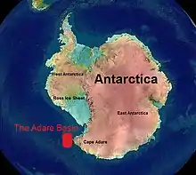 The Adare Basin is a geologic structural basin located north-east of Cape Adare of Antarctica, for which its named, and north of the western Ross Sea. The Adare Basin is an extensional rift basin located along a seafloor spreading center that forms the failed arm of the Tertiary spreading ridge separating East and West Antarctica, known as the West Antarctic Rift System and similar in structure to the East Africa Rift System. Centrally located in the Adare Basin is the Adare Trough. The extension of this rift system is recorded in a series of magnetic anomalies which run along the seafloor at the extinct, north–south trending, Adare spreading axis.[1][2][3] The Adare spreading system continues unbroken into the Northern Basin underlying the adjacent Ross Sea continental shelf. [4][5]