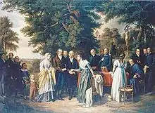 The educational reform introduced by Franz Friedrich Wilhelm von Fürstenberg, Vicar-General of Münster, induced her to take up her residence in the Westphalian capital. She was able to gather around her, at Münster, a mystical-literary cenacle which had a considerable influence on German intellectual and religious life at the time.[3] Here she soon became the centre of a set of intellectual men led by Fürstenberg. This circle also included the gymnasial teachers (whom she incited to the deeper study of Plato), Bernhard Heinrich Overberg, the reformer of popular school education, Clemens August von Droste-Vischering, Count Leopold zu Stolberg, and the philosopher Johann Georg Hamann, who was interred in her garden. The poet Matthias Claudius of the "Wandsbecker Bote" was also a familiar visitor, and Johann Wolfgang Goethe said that his hours in this circle were among his most pleasant recollections.[2]