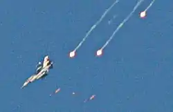 The second manipulated image was reported by the pseudonymous blogger "Dr. Rusty Shackleford" on his blog "The Jawa Report".[6][7] Reuters captioned it as showing an Israeli F-16 fighter jet firing ground-attack missiles "during an air strike on Nabatiyeh", but the F-16 was actually deploying one defensive flare, and the original photograph showed only one flare.[8][9] The photo had been doctored to increase the number of flares falling from the F-16 from one to three, and misidentified them as missiles.