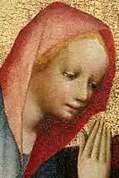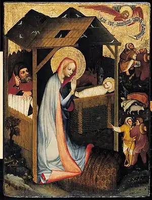 The central figure of the Virgin Mary leaning over the Infant Jesus in his cradle is accompanied on the left by the kneeling and gesticulating Joseph. The Virgin Mary is kneeling on a brocade cushion in a simple wooden hut. She is dressed in a blue cloak with a red inner lining that is folded back on her head and covers her hair. Its drapery is modelled in long vertical folds that suppress the physical mass of the elongated figure. It was only restoration undertaking in the 1960s that revealed the perfection of the painting. According to Pešina,[6] the delicate charm of Mary's feminine face, the soft modelling of its shape that almost melts into light, the colour harmony and the radiance of the lazure painting surpasses the quality of the Třeboň Altarpiece. The typology of the faces – the female face with its delicate nose and chin, Joseph's whiskery face, just like the character of the rocky landscape with its stunted trees, brightly coloured birds and details observed from nature, corresponds to other works by the Master of the Třeboň Altarpiece.[7][8]
