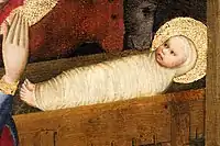 The infant, who is entirely wrapped in swaddling reminiscent of a shroud and is lying in the wooden crib in the shape of a coffin, refers to Jesus's future martyrdom. The image represents a new iconographical type that developed out of the earlier scene of Nativity of Jesus through the influence of mystical trends in the church at that time (the Vision of St Bridget of Sweden, 1380).[11] According to this interpretation, Mary recognised Jesus's divinity after he was born and began worshipping him spontaneously. It is, in this case, a devotional image designed to encourage piety among the faithful.[12]