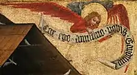 The hut is depicted from three different angles in an imperfect perspective that, even so, evokes the impression of spatial depth. In the landscape, which still recalls the work of the Master of the Třeboň Altarpiece, there are two pairs of shepherds on the right in different spatial planes that depict events of the past: the Annunciation and journeying to the stable in Bethlehem. In the top right-hand corner, we see the angel of the Annunciation with a ribbon bearing the inscription 'Ecce ego annun[t]io vobis Gaudium'.[9] The grazing animals on the right symbolise the Old (the goat) and New Testament (the sheep). They are accompanied by a couple of pigs and cows. The heads of a donkey and an ox appear in the stable behind the crib.[10] The main figures (Mary and Joseph) are portrayed in a hieratical perspective as proportionally larger.
