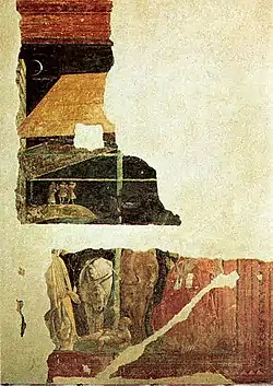 Adoration of the Christ Child was a 1431 or 1437 fresco by Paolo Uccello – some of the members of the family which commissioned it are shown.[1] It was originally painted on a wall in the sacristy of San Martino church in Bologna, but it was later hacked off that wall, meaning that only two fragments survive. These are now on show in the first chapel on the left on the north aisle of the church's nave. On one of the fragments is a date starting 143, though it is unclear if the final digit is a 1 or a 7.[2]