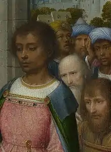 Like many Early Netherlandish paintings, it has been attributed to many other painters in the past, as understanding of the period developed. The painting auctioned in 1830 was described as by Jan Gossaert, and in the Aders sale and Green collection it was described as a Hans Memling. Of the early authorities, Gustav Friedrich Waagen in the 1850s called it "School of van Eyck" and Johann David Passavant in the 1830s a "Rogier van der Weyden the younger". The National Gallery cautiously first catalogued it merely as "Flemish School", only changing to David in 1920.[2] This had first been suggested by Georges Hulin de Loo in 1902, although he did not think the painting was from the hand of the master himself. In 20th century scholarship the main issue debated was the share of work between master and workshop.[2]
