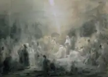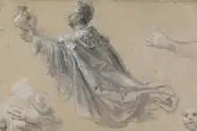 To prepare the work, Sequeira made a main preparatory study, in charcoal and white chalk, on the same scale as the final painting. Then, he made individual, detailed sketches of some of the figures, to hone postures, gestures, and facial expressions: there are more than twenty-five such sketches.[4] These are all part of the collections of the National Museum of Ancient Art; they were purchased for the Royal Academy of Fine Arts, an institutional ancestor of the museum, in 1878, following the death of the Marquis of Sousa Holstein.[7] José-Augusto França compares the skill Sequeira shows in these sketches as a draftsman to that of Tintoretto.[1]