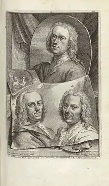 Portrait of Adriaan van der Burg above his two pupils Aert Schouoman (left) and Cornelis Greenwood (right).