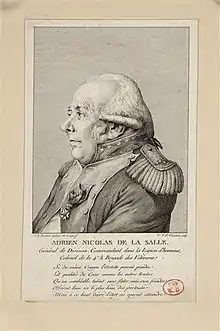 - ↑ Tableau de la vie militaire d'Adrien-Nicolas La Salle, maréchal de camp le 1er avril 1791, depuis commandant de la province de l'ouest de S. -Domingue, et deux fois gouverneur général, par intérim des isles sous le vent. [Paris?], 1794. (John Carter Brown Library, Providence, Rhode Island).