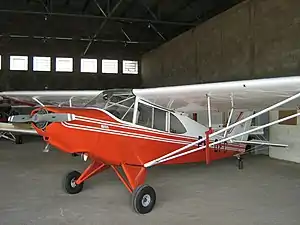 The primary flight commands are actuated by cables and pulleys. The ailerons and flaps are made of aluminum alloy, while the rudder and elevators are made of steel tubes and fabric. The flaps have four positions (neutral, 15°, 30° and 45°), and are actuated manually, by a lever in the upper left part of the cockpit. The pitch trim tab is located in the trailing edge of the left elevator, and is actuated by a handle in the left side of the cockpit. The rudder and the left aileron also have ground-adjustable trim tabs.
