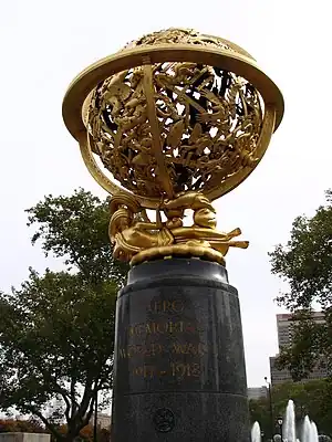 The Aero Memorial is a gilded bronze sculpture by Paul Manship, commissioned by the Association for Public Art (formerly the Fairmount Park Art Association).[1] Aero Memorial is located in Philadelphia's Aviator Park, across from The Franklin Institute at 20th Street and the Benjamin Franklin Parkway. The memorial is a tribute to those aviators who died in World War I, and it was initiated by the Aero Club of Pennsylvania in 1917 with the help of the Fairmount Park Art Association. The Aero Club donated modest funds into the Fairmount Park Art Association in 1917 for the creation of the memorial, and after years of fundraising, the Art Association was finally able to contact Paul Manship for the commission 1939. The idea for a celestial sphere was approved in 1944, and the sculpture was completed in 1948.[2] Aero Memorial was dedicated on June 1, 1950. Aero Memorial is one of 51 sculptures included in the Association for Public Art's Museum Without Walls interpretive audio program for Philadelphia's outdoor sculpture.