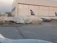 On 14 June 2019, the IAC published their interim report,[19] presenting a detailed reconstruction of the accident, but they did not draw any conclusions. The pilots did not request active storm avoidance from air traffic control. However, they entered the second segment of the departure, initiating a right turn away from the storm earlier than prescribed. The pilot flying had difficulty maintaining altitude in manual flight during an orbiting manoeuvre in a 40-degree bank and deviated by more than 200 ft (61 m) from his assigned altitude, triggering multiple aural alerts. The crew omitted to perform the approach briefing and the approach checklist, and did not set the go-around altitude.[20][21] The aircraft deviated below the glideslope descending through 270 ft (82 m) AGL and the pilot increased engine thrust; the aircraft accelerated to 15 kn (28 km/h) above its required approach speed. During landing, sidestick inputs were "of an abrupt and intermittent character", including wide-amplitude, sweeping pitch movements not observed during approaches in normal flight law, but similar to other Aeroflot pilots' direct flight law approaches. The report also noted that the pilots ignored a windshear warning that would have required a go-around unless it was spurious.[22] Investigators found traces of lightning impact on antennae, various sensors, exit lights and the cockpit windows. Investigators re-examined the design of the landing gear and found that it met certification requirements. The report cited a material provided by Sukhoi claiming that contemporary certification requirements did not consider the effect of "secondary impacts of the airframe on the ground after the destruction of the landing gear". The interim report did not look into the survival factors of the accident, citing that they were still being analyzed and would be included in the final report.[9]