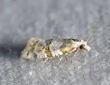 The length of the forewings is 3.9–5.7 mm. The ground colour of the forewings is white with buff to raw umber markings. The hindwings are drab.[4] Adults are on wing from April to September,[5] probably in multiple generations per year.